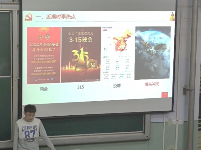 随后,宣传委员李鹤新秉着“直面热点、理性述评、针砭时弊、激浊扬清”的观念针对2022年全国两会、3·15晚会、新冠疫情和俄乌冲突带来了时事热点问题的分享,重点针对目前疫情态势进行了分析,3月以来,国内外疫情出现反复,不少国际政客就此发表不实言论,李鹤新同志就此类问题给出讨论分析,并叮嘱大家疫情期间,最重要的就是保护好自己,服从学院、学校的统一管理,做到不信谣、不传谣,在做好自我防护的同时,积极带动班级同学做好防护。